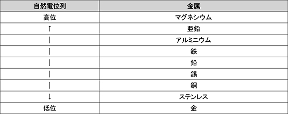 下表は海水中の金属の自然電位列の例であるが、一般的に電位の異なる金属を水等の電解液中で接触させると、電位の低位にある金属が高位にある金属を浸食することが知られている。