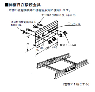 熱伸縮の対策として、通常、鋼製ケーブルラックで直線30mごと、アルミニウム合金製ケーブルラックで直線15mごとに「伸縮自在接続金具」を使って施工してください。