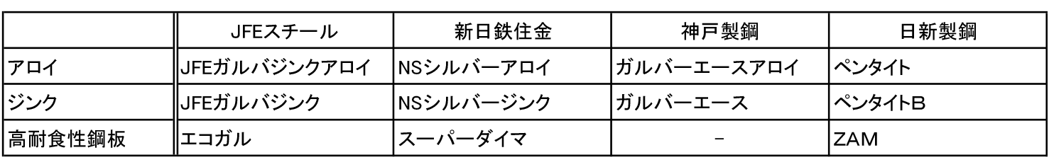 ジンク・・・ 非合金化溶融亜鉛めっき鋼板。耐食性に優れる。無塗装使用に適する。