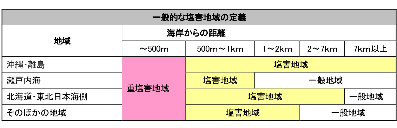 | 注) | 台風など、強風が吹いた場合には、塩害地域でなくても塩害が発生することがあります。 |