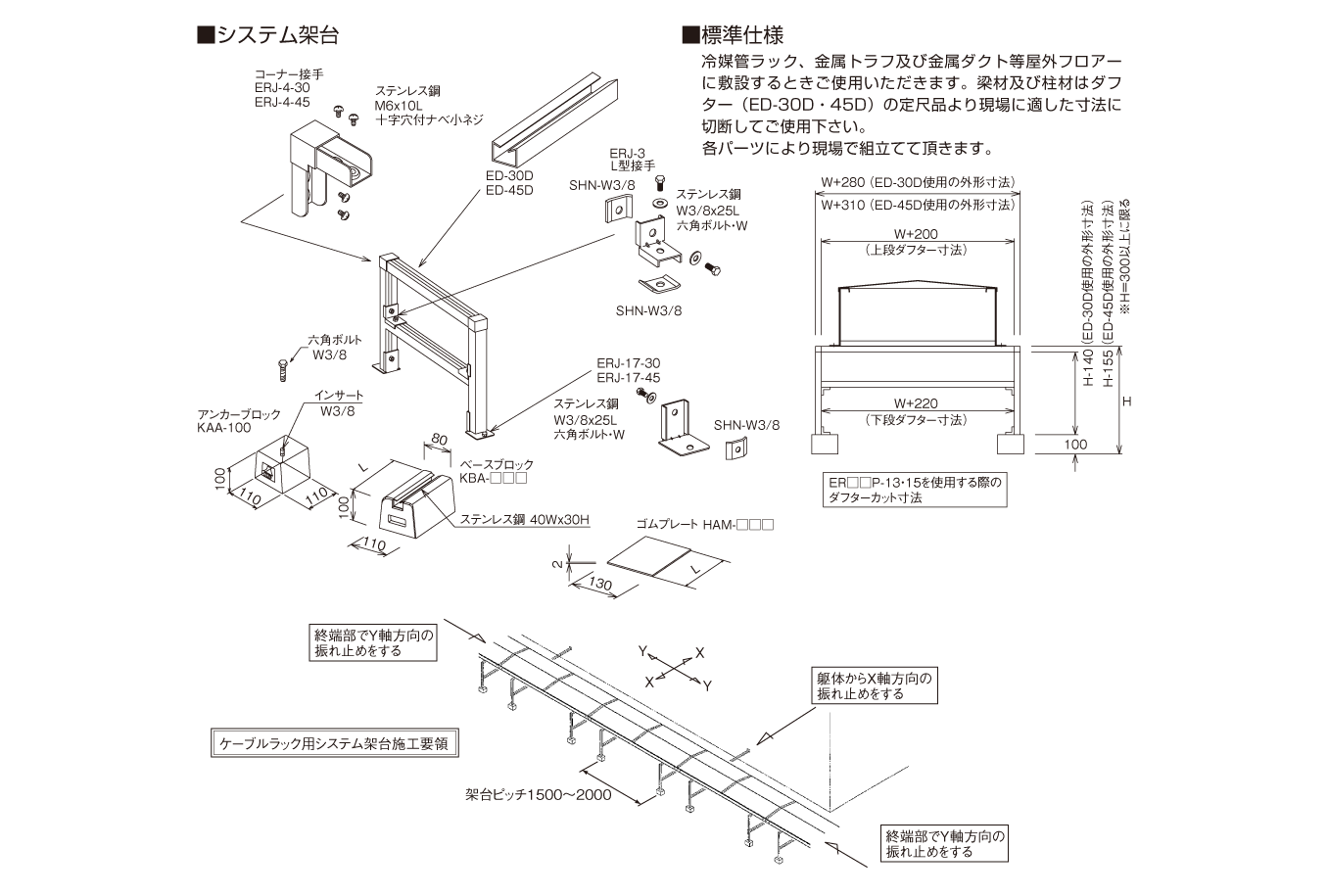 冷媒管ラック、金属ダクト等屋外フロアーに敷設するとき現場で組立て出来る支持材システム